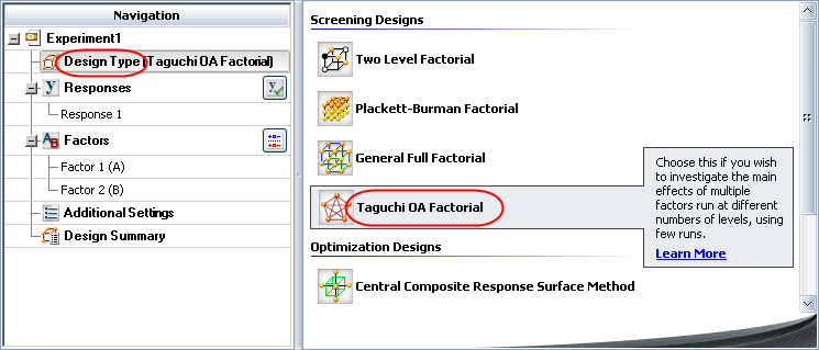 Select Design Type in the folio's navigation panel, and then select Taguchi OA Factorial in the input panel.