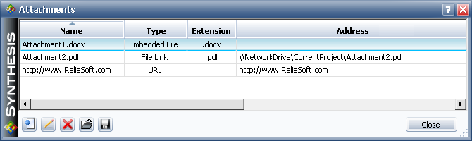 All Synthesis applications support attachments at the project level. In all applications, project attachments can be displayed/managed from the Attachments icon in the Project Properties window.