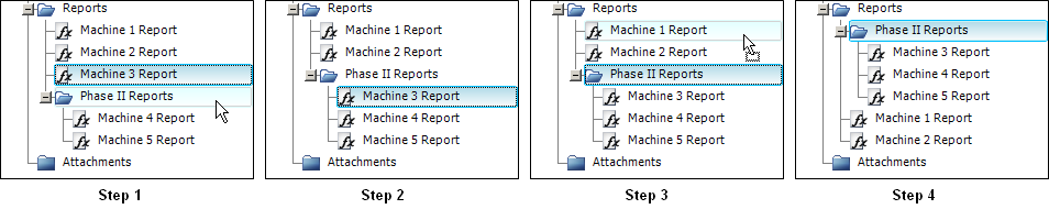 In Step 1, Machine 3 Report is being dragged onto the Phase II Reports folder. Step 2 shows that Machine 3 Report is then located at the top of the list within the Phase II Reports folder. In Step 3, the Phase II Reports folder is being dragged onto Machine 1 Report. Step 4 shows that the Phase II Reports folder is then positioned above Machine 1 Report.
