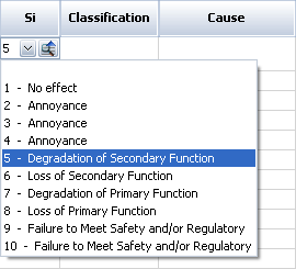 To edit a cell that contains a rating or a drop-down list (e.g., severity rating or classification), double-click the cell to display a list with the available options, as shown next.