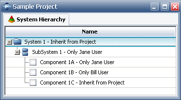 For a quick way to reset all of the item permissions to the defaults, you can open the Item Permissions window for SubSystem 1, set to Inherit from parent item and select the Apply to all dependents check box. The resulting system hierarchy is shown next.