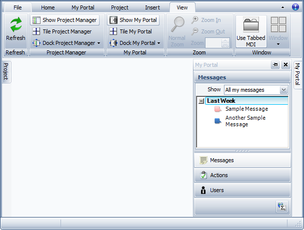 As an example, the following picture shows the Project Manager panel docked on the left side of the MDI, unpinned and hidden, while the My Portal panel is docked on the right side of the MDI, unpinned and visible (either because the user moved the pointer over or clicked the tab).