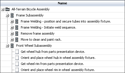 First, use the system hierarchy to define and organize the different steps that compose the overall process. The following example shows a bicycle assembly process that is defined in the system hierarchy.