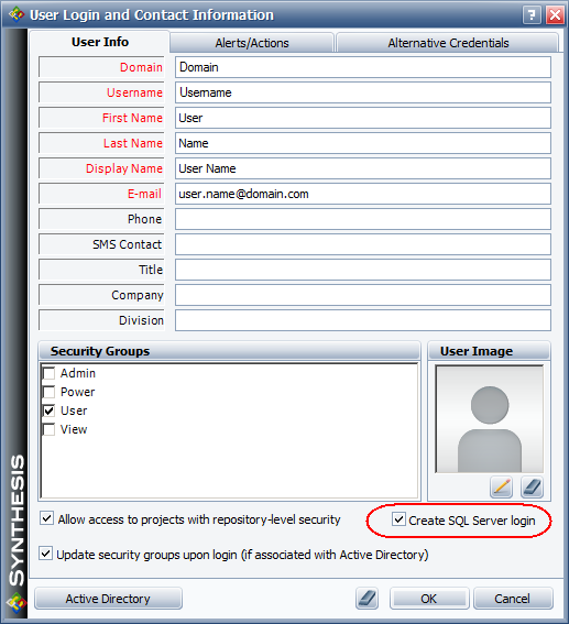 If the user belongs to an Active Directory group that has a SQL Server login shared by all members of the group and that group has access to the application database, you can clear the Create SQL Server login check box that is displayed when you are adding or importing a user account.