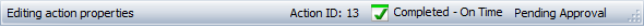 Now in Version 10, the action’s status bar displays two complementary status indicators. The first one is based on the actual and expected start date and completion date. It indicates that the action is not started, in progress or complete and whether it is on time or running late. (See Action Timeline and Status.)