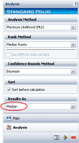 By default, Weibull++ calculates the point estimates from the median value of the posterior distribution. This is because the median value always corresponds to the 50th percentile of a distribution. You have the option to change this setting and calculate the mean value of the posterior distribution instead; however, note that the mean is not a fixed percentile and this could cause issues when comparing results across different data sets. The option to change this setting is available on the Analysis page of the control panel when you choose the Bayesian-Weibull analysis, as shown next.