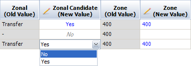 If you don't want the task to be considered for zonal analysis even though it meets the requirements, you can click inside the Zonal Candidate (New Value) column and choose No from the drop-down list. If this column displays No in italics, this indicates that at least one of these conditions is not met and the property cannot be changed.