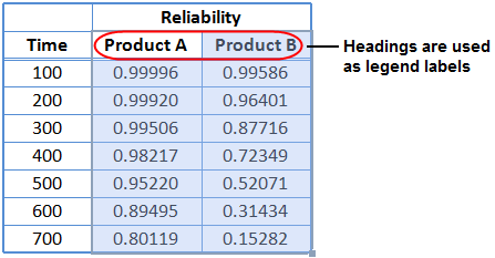 Select the cells that contain the data of interest. In the example data below, the headings are included in the selection and will be used as the legend labels.