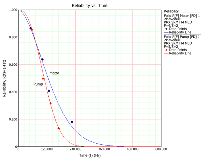 You can visually compare the reliability of the components by fitting a distribution to the failure data and then generating an overlay plot. For example, the following overlay plot shows the failure data for the motor and for the pump, both analyzed using the 2-parameter Weibull distribution.