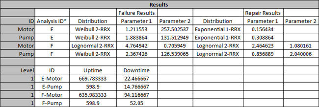 In this example, the first table shows the failure and repair distributions for each component due to each type of event. The second table shows the total uptime and downtime for each component due to each type of event.