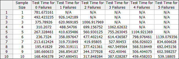 In the Solve for area, select Test time for given sample size so the table shows test duration values as a function of sample and number of allowable failures.