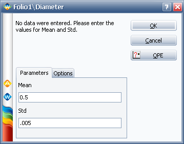 Click OK. The data sheet will be empty but the parameters of the distribution will be visible in the Analysis Summary area of the control panel.