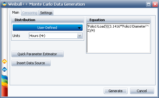 In the distribution drop-down list, choose User-Defined. Enter Eqn. (S.1) in the Equation field and click the Insert Data Source button to insert the distributions of the variables in the equation, as shown next.