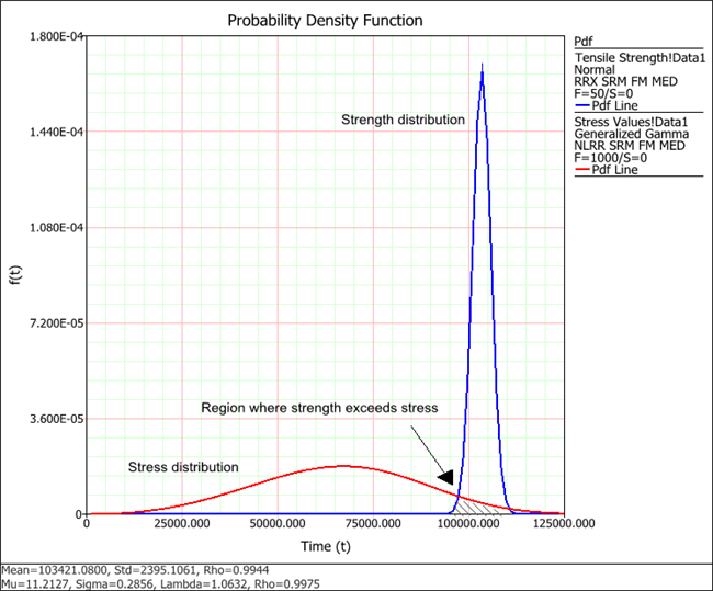 The stress-strength test shows the following plot (with the scaling adjusted and an area of the plot shaded to show the region where the strength exceeds the stress).