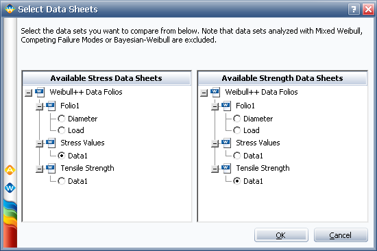 Select the data sheets containing the stress and strength data, as shown next. Click OK.