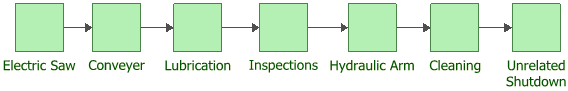 In the Transfer to BlockSim window, select which components you wish to transfer and click OK. The selected components will be transferred to BlockSim as blocks that are connected in a reliability-wise series configuration, as shown in the following example. You can then edit the reliability block diagram in the BlockSim application, if desired.