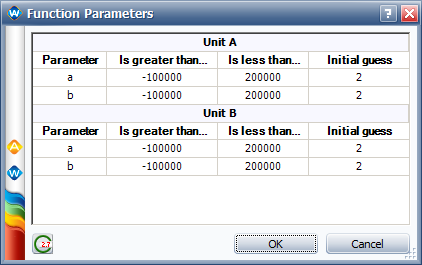 In the Is greater than and Is less than columns, set an estimate for the minimum and maximum values for each parameter in the equation. If the iteration does not converge at the specified range, you will need to edit the range values until a solution can be obtained.