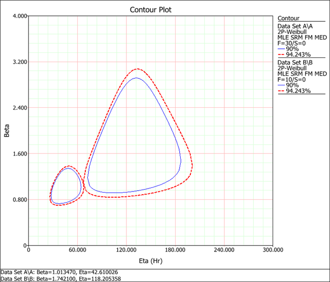 In Weibull++, contour plots are typically used to compare data sets. For two contour plots that are superimposed in an overlay plot, the Plot Critical Level check box will be available, as shown next. This allows you to calculate and display the minimum confidence level at which the two contour plots intersect. At any confidence level below the critical level, the contour plots will not overlap and there will be a statistically significant difference between the data sets at those levels.