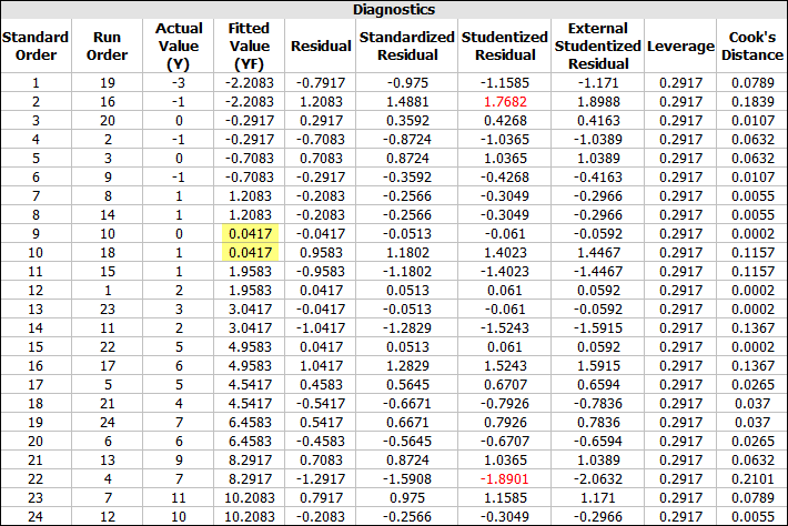 Click the View Analysis Summary icon on the control panel. In the Analysis Summary window that appears, view the Diagnostic Information table. The table is shown next. In order to identify which factor settings can provide the smallest height deviation, look for the runs in the table with the Fitted Value (YF) closest to zero (highlighted).
