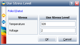 The Stress area of the window lists every stress that will be used in the calculation. In the Use Stress Level area, enter the stress level that the product will experience under normal conditions. For example, to specify that the normal operating temperature for a product is 328 K and the normal operating voltage is 2 V, you would enter the following into the window: