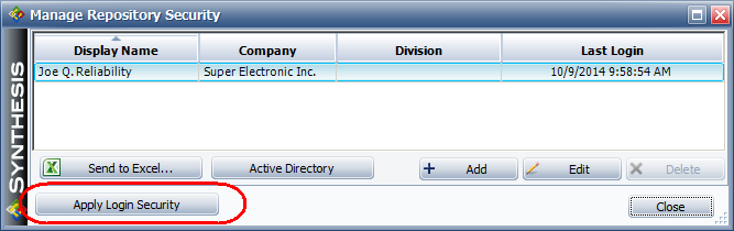 For an existing standard database, you can apply login security at any time by choosing File > Manage Repository > Authorized Users and then clicking the Apply Login Security button at the lower left corner of the window.