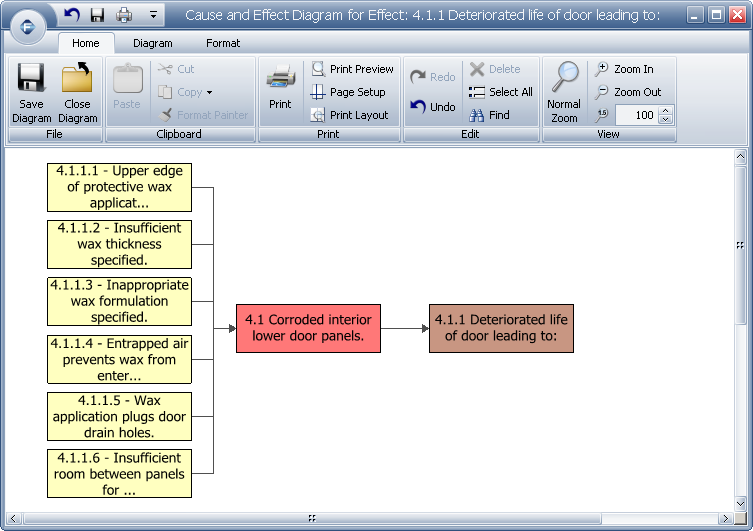 Xfmea allows you to automatically create a cause and effect diagram based on the current analysis. The cause and effect diagram (also know as a fishbone or Ishikawa diagram) is available for items and effects and it presents all of the events that lead up to the selected effect or item failure.