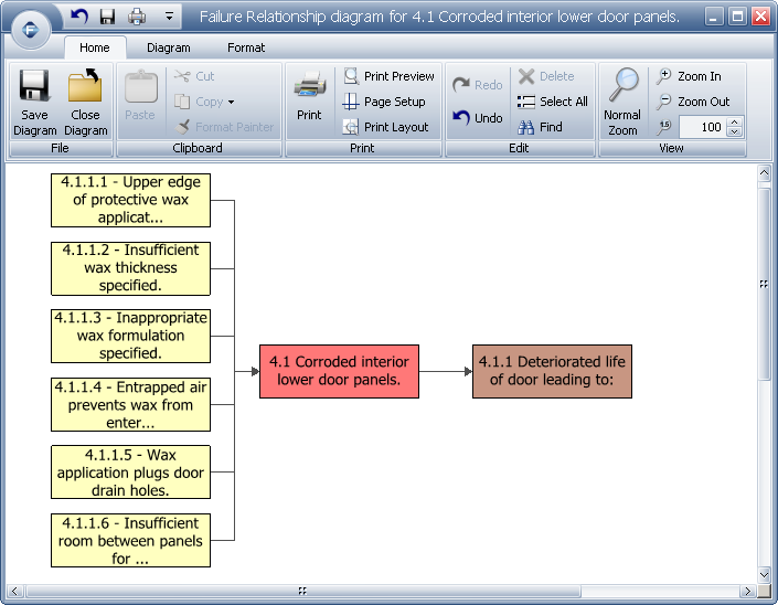 Xfmea allows you to automatically create a failure relationship diagram based on the current analysis. The failure relationship diagram is available for failures and it presents all of the causes and effects that have been defined for the selected failure.