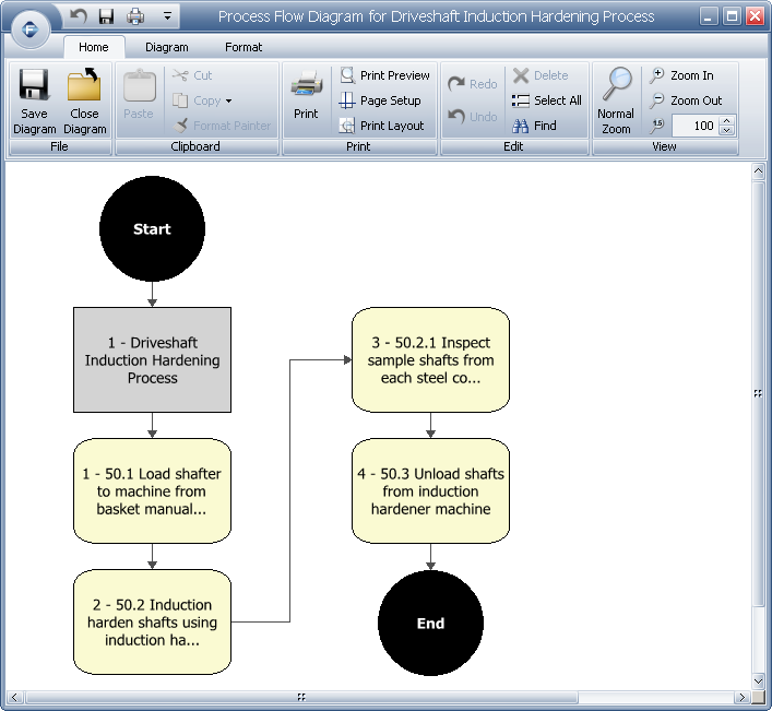 Tip: If you want to use the process flow diagram as a starting point for preparing process FMEAs (PFMEAs) or control plans, then the PFD worksheet may be a more appropriate tool. The PFD worksheet integrates the chart into a worksheet that records more detailed information about each step in the process and it allows you to synchronize the relevant information with the PFMEA or control plan analysis. (See PFD Worksheets.)
