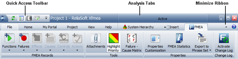 Active (contextual) tabs contain commands related to a type of analysis. These tabs are displayed only when the related analysis is active. For example, the FMEA tab contains commands related to working on an FMEA, while the Control Plan tab contains commands related to working on a control plan.