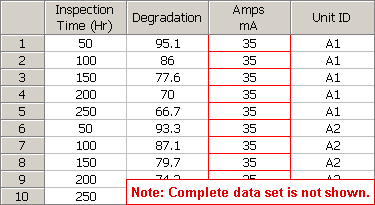 Each row in the ALTA degradation analysis data sheet is a degradation measurement for a specified test unit at a given stress level. For example, the following shows data for two LED units, A1 and A2, whose light intensity was inspected every 50 hours.