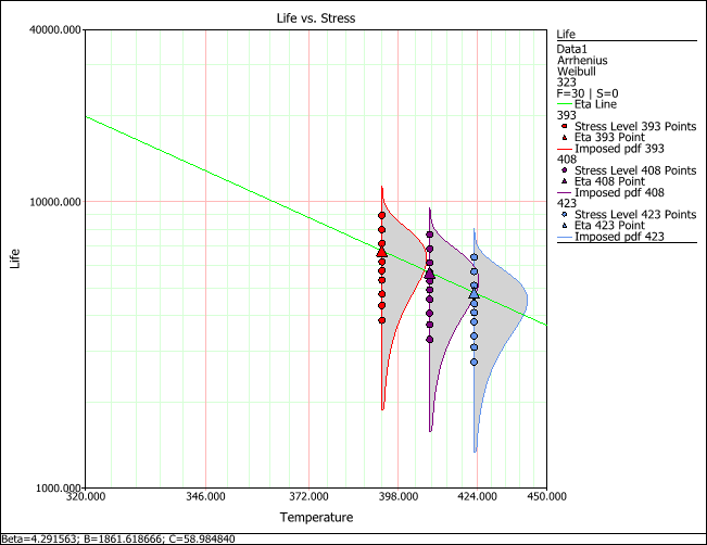 The Life vs. Stress plot shows the effect of a stress on the life of the product. Multiple pdfs, each at a different stress level used in the test, are displayed on the plot. The failure times obtained at each stress level are shown at the base of the associated pdf. Note that the lines and pdfs are mapped to the use stress level, but the failure times are plotted at the tested conditions.