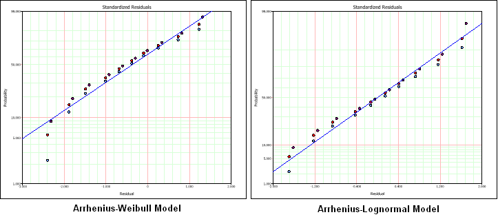 For example, the next figures show the results of an Arrhenius-Weibull model and an Arrhenius-lognormal model using the same data set. As you can see, the plot shows that the lognormal distribution presents the better fit to this particular data set.