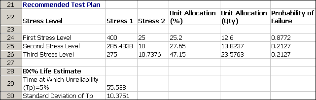 The Test Plan Results sheet displays a summary of your inputs, the utility's recommended test plan and the time at which unreliability equals the value you entered in BX% Life Estimate Sought field (i.e., Tp). If you entered a number of available test units, it also displays the standard deviation of Tp.