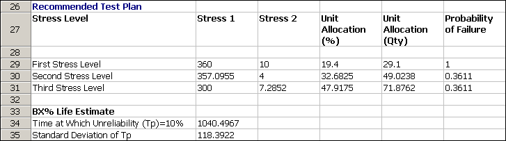 The recommended stress levels and unit allocations are displayed under the Recommended Test Plan heading near the bottom of the results sheet. This area of the sheet is shown below.
