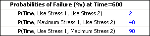 Each probability of failure is a function to time and two stress levels. For example, the value entered in the P(Time, Use Stress 1, Maximum Stress 2) field is the probability of failure at 600 hours (specified in the Available Test Time field), assuming the product experiences the specified use stress level for the first stress (300 K) and the specified maximum stress level for the second stress (10 V). The stress values were entered in the Stress 1 and Stress 2 areas.