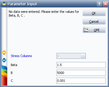 Note: If you have more than one stress column selected to be used in the analysis and you attempt to calculate an empty data sheet using a proportional hazards or general log-linear model, the Columns drop-down list will be enabled in the Parameter Input window. With this drop-down list, you can select how many stresses to include in the model. You cannot choose to use more stresses than are selected to be used in the analysis.
