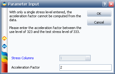 To perform an accelerated life testing data analysis, you need information about how the product behaves at more than one stress level. If you select to use an Arrhenius, Eyring or inverse power law (IPL) model and attempt to calculate the data sheet with data for only one stress level, the Parameter Input will appear as shown next and ask you to specify an acceleration factor that allows the software to calculate how the product behaves at other stress levels.
