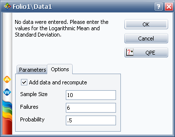 The Options tab allows you to generate a data set based on a sample size, number of failures, probability and the parameters you have entered in the Parameters tab. Select the Add data and recompute check box to enable this feature, as shown next.