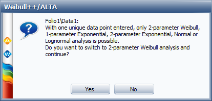 With only one unique data point, only the 2-parameter Weibull, 1-parameter exponential, 2-parameter exponential, normal and lognormal analyses are possible. If you select a different distribution, a message box will appear notifying you that you need to switch analysis types, as shown next.