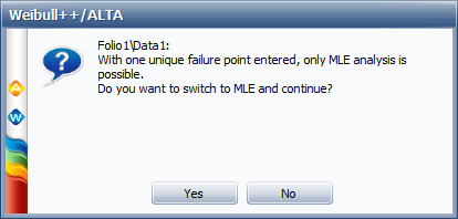 If you enter only one unique failure and at least one suspension with any analysis method other than MLE, the application will notify you that only MLE is possible.