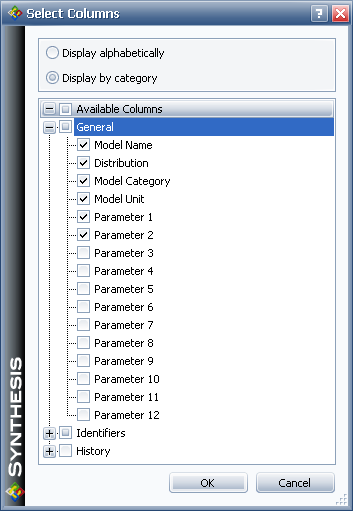 The columns that are available in this window will vary depending on the type of item you are working with. The Column Chooser for models is shown next.