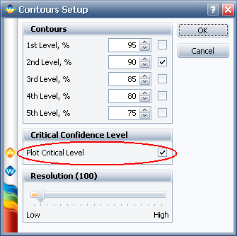 Contour Plots are available only for the 2- and 3-parameter Weibull, normal and lognormal distributions in Weibull++. The first time you select a Contour Plot from the Plot Type drop-down list, the Contours Setup window will appear. This window allows you to select the contour lines to be shown, the confidence levels represented by the lines and the resolution used to draw the lines.