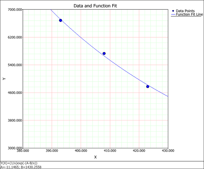 To visually assess how well the function fits the known data points of the equation, click the Plot icon on the control panel. The Data and Function Fit plot is shown next (with the scaling adjusted).