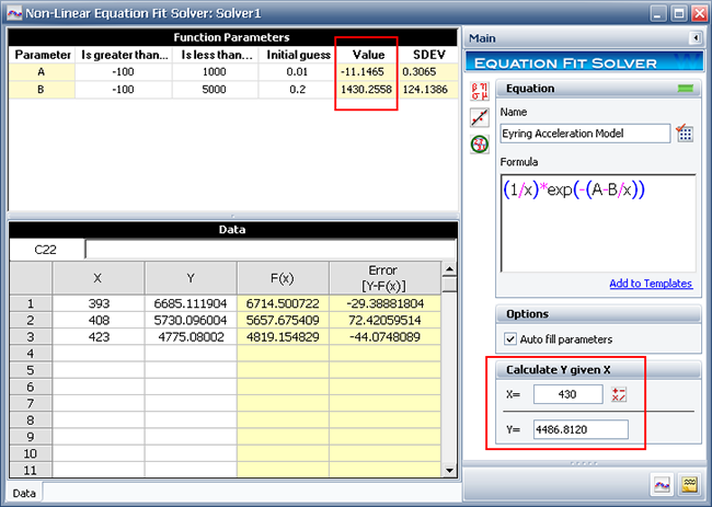 The parameter values are found to be A = -11.1465 and B = 1430.2558, as shown next. By obtaining the parameters, we can now estimate the mean life (y) for any given stress level (x) by using the Calculate Y given X tool. For example, in the figure shown next, the estimated mean life for a temperature of 430 K is 4486.81 hours.
