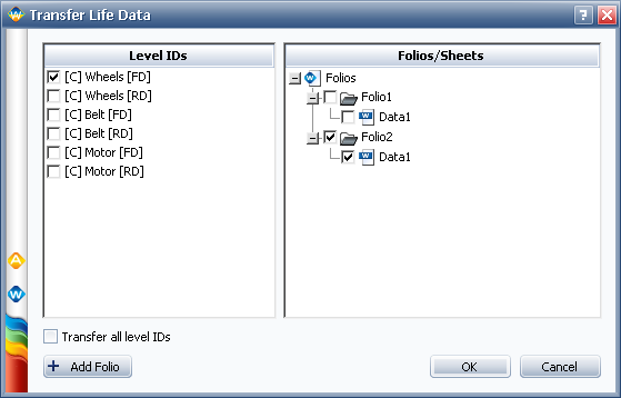 From the Level IDs column, select the data set you wish to transfer. From the Folios/Sheets column, select the data sheet of the folio you wish to transfer the data to. To transfer all the data at once, select the Transfer all level IDs check box.