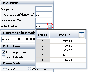To display actual failure times as points that can be compared against the estimated intervals, click the arrow in the Actual Failures box. A table will appear where you can enter the recorded failure times, as shown next. The entered times will be automatically sorted from least to greatest