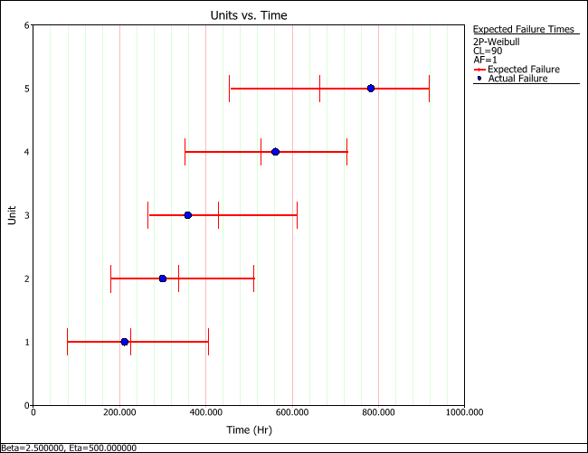 The plot will show the predicted failures times for each test unit with a margin of error corresponding to the confidence level you entered in the Plot Setup area.