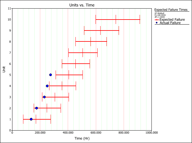 The following plot shows the first five actual failures displayed with the ten expected failure times.