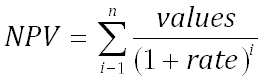 If n is the number of cash flows in the list of values, the formula for NPV is: