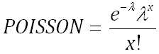 Description: Returns the Poisson distribution. A common application of the Poisson distribution is predicting the number of events over a specific time, such as the number of cars arriving at a toll plaza in 1 minute.